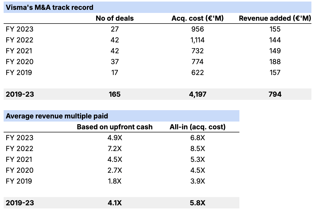 In 2019-23, Visma closed 165 acquisitions, adding €800M of revenue (but only -€9M in aggregate profits). Total acquisition cost was over €4B.