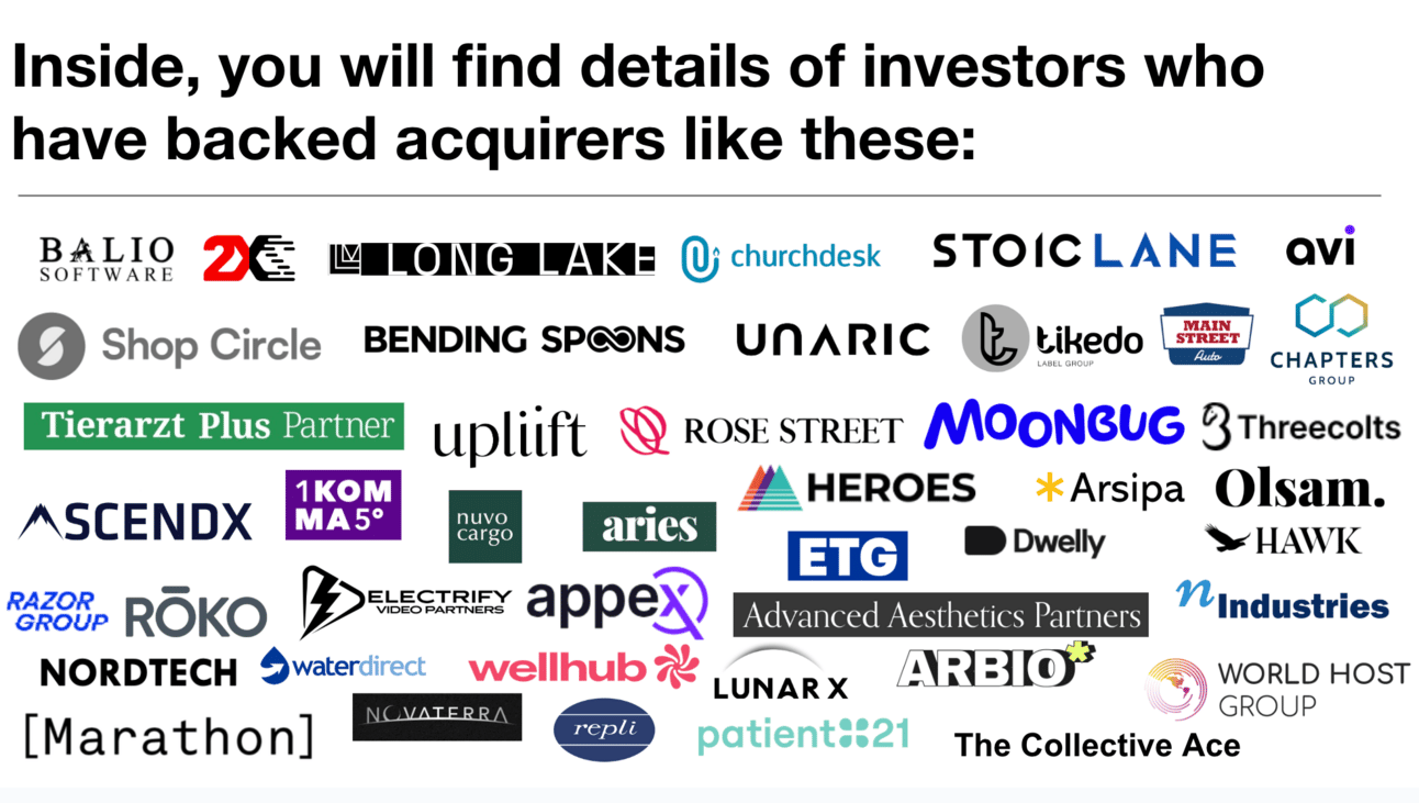 For the second bit, we parsed through cap tables of 70 non-sponsor backed serial acquirers of software, industrial SMEs, mobile apps, Youtube channels, Airbnb listings, medspas, vet clinics… and more.