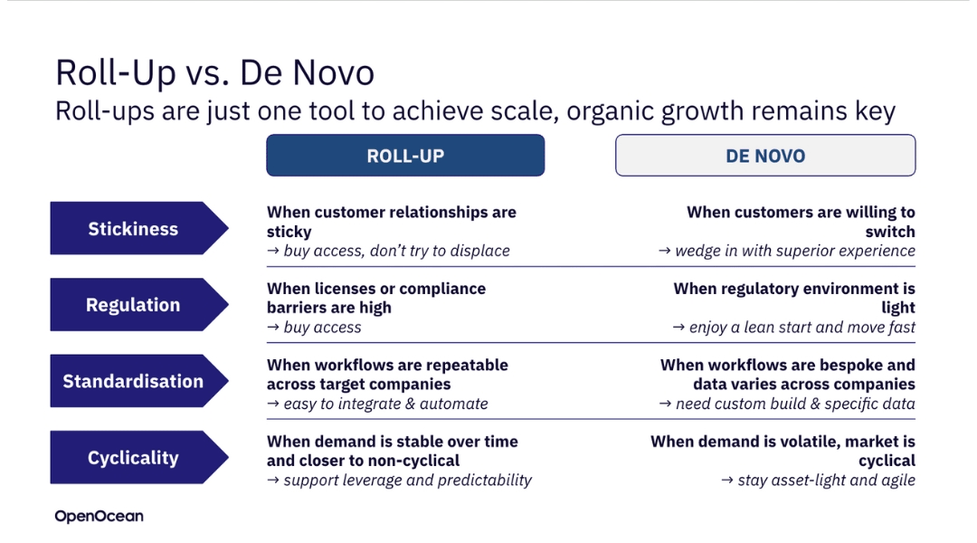Correct, says Cyrus. Rollups work best in sticky, regulated, standardised, and non-cyclical verticals. Whereas “de novo”, or organic strategies work best in agile, lightly regulated, fragmented, and volatile verticals.