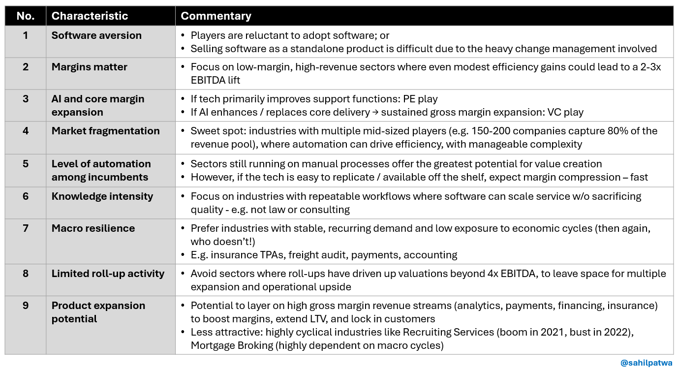 Cyrus offered a slightly different angle, by weighing up industry revenue quality against AI uplift. As the first step, find industries characterised by a) high quality revenue (recurring, high cash generation) and b) high volumes of repetitive, labor-intensive workflows. Then, automate these workflows with AI, so as to unlock genuine productivity gains for human employees (more customers served per FTE etc.).