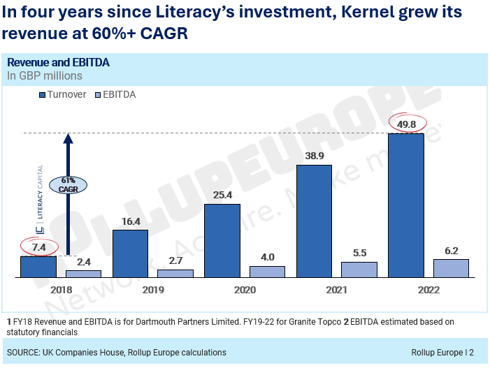 In 2018, it supported Dartmouth’s CEO Logan Naidu on the MBO. 6 years, one bolt-on and one rebranding later, the enlarged business - now called Kernel Global - was recapitalised by another sponsor, netting Literacy a 9.8x return on the original investment (including 6.7x on the realised portion and 3.2x on the retained minority stake).