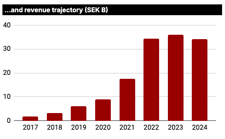 The share popped 30% on the first day of trading. It didn't matter that over half of the shares offered were secondary (source), and that key 4 executives (Kaplan, Bjärgård, Bergström and Ahlgren - the longtime Head of BU Services) cashed out almost SEK 6B (source: IPO prospectus).