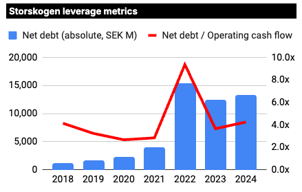 It was about time! Sweden’s benchmark interest rate had been negative since 2014. In early 2016, the rates were cut further, to a low of -0.5%. In this era of loose money, Storskogen’s net debt began to ramp up, growing from an average of c.3x of operating cash flow in 2019-21 to 9x in 2022.