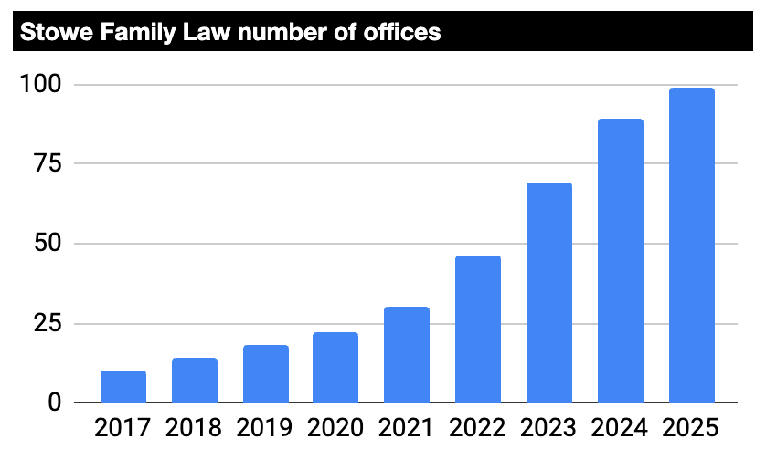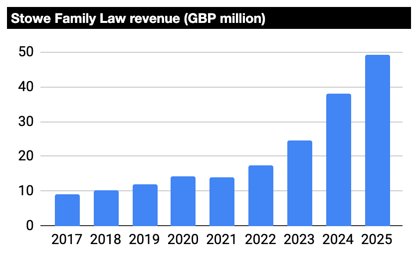 The introduction of Divorce, Dissolution and Separation Act in April 2022 made the administrative act of ending a marriage easier. Digital divorce applications and fixed-fee legal packages are now common, with law firms chasing the lucrative ancillary business of dividing assets and custody. As a result, the number of family law firms dropped by 20% between 2018 and 2025 (from 5,700 to 4,700 - source 1, source 2). This, however, benefited digitally savvy operators like Stowe who were able to profitably execute low-margin but high-volume work.